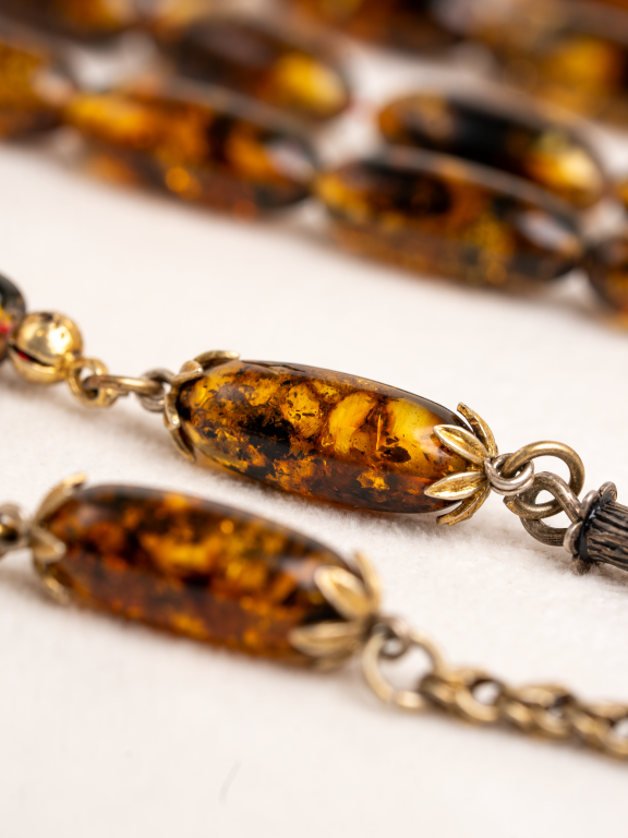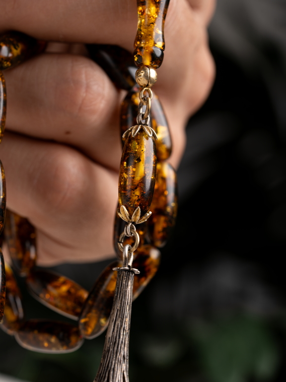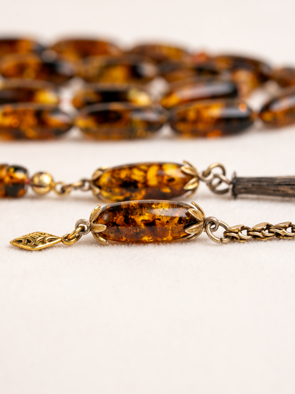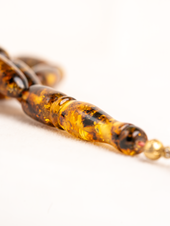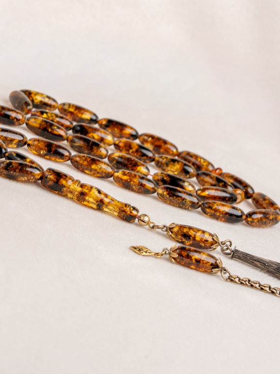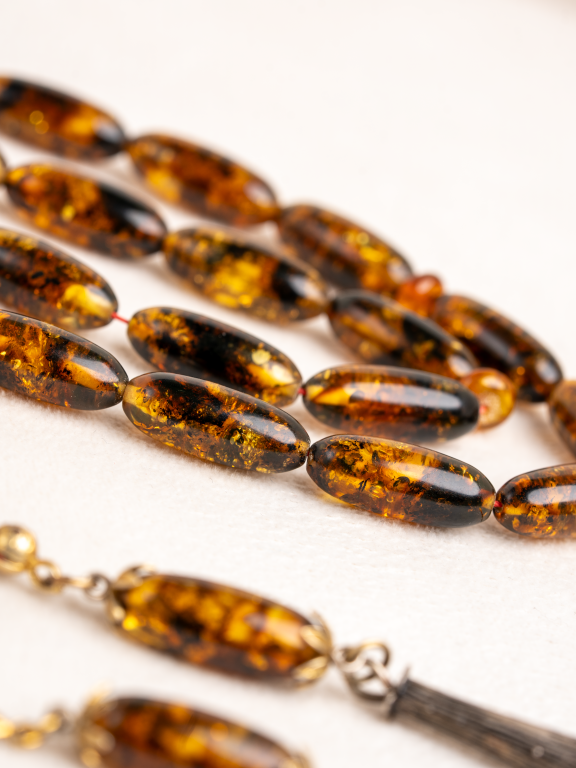 مسباح من الكهرمان الروسي القديم، يتميز بخرز تنجيم “نجوم داخل الخرز” يحمل عمقًا لونيًا غنيًا وتدرجات دافئة تعكس جمال القطعة مع كل حركة