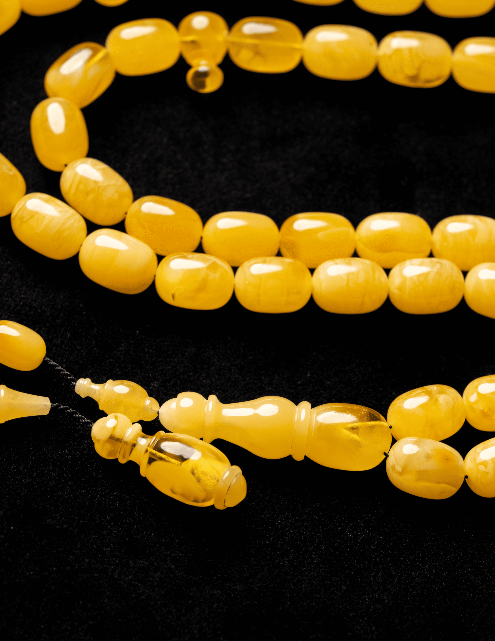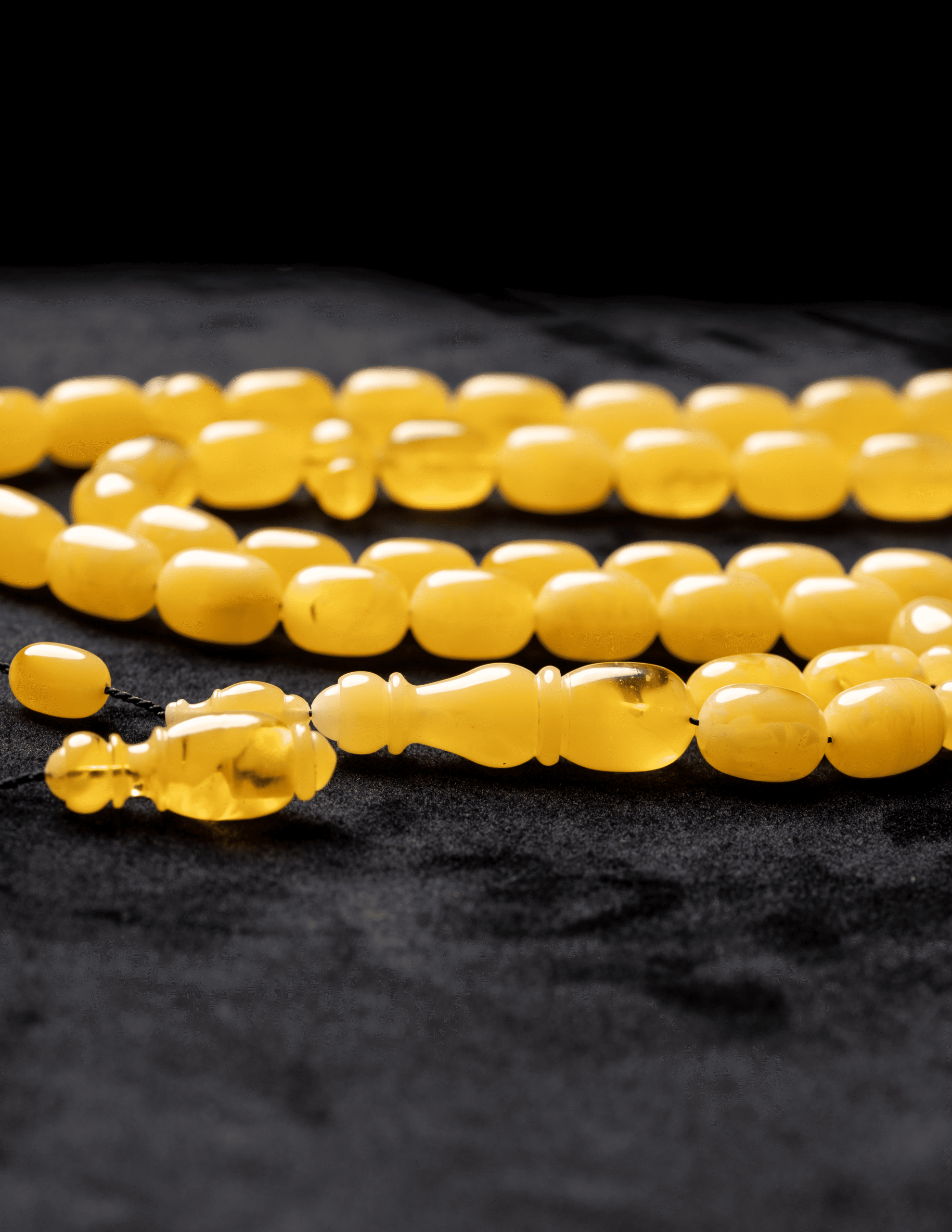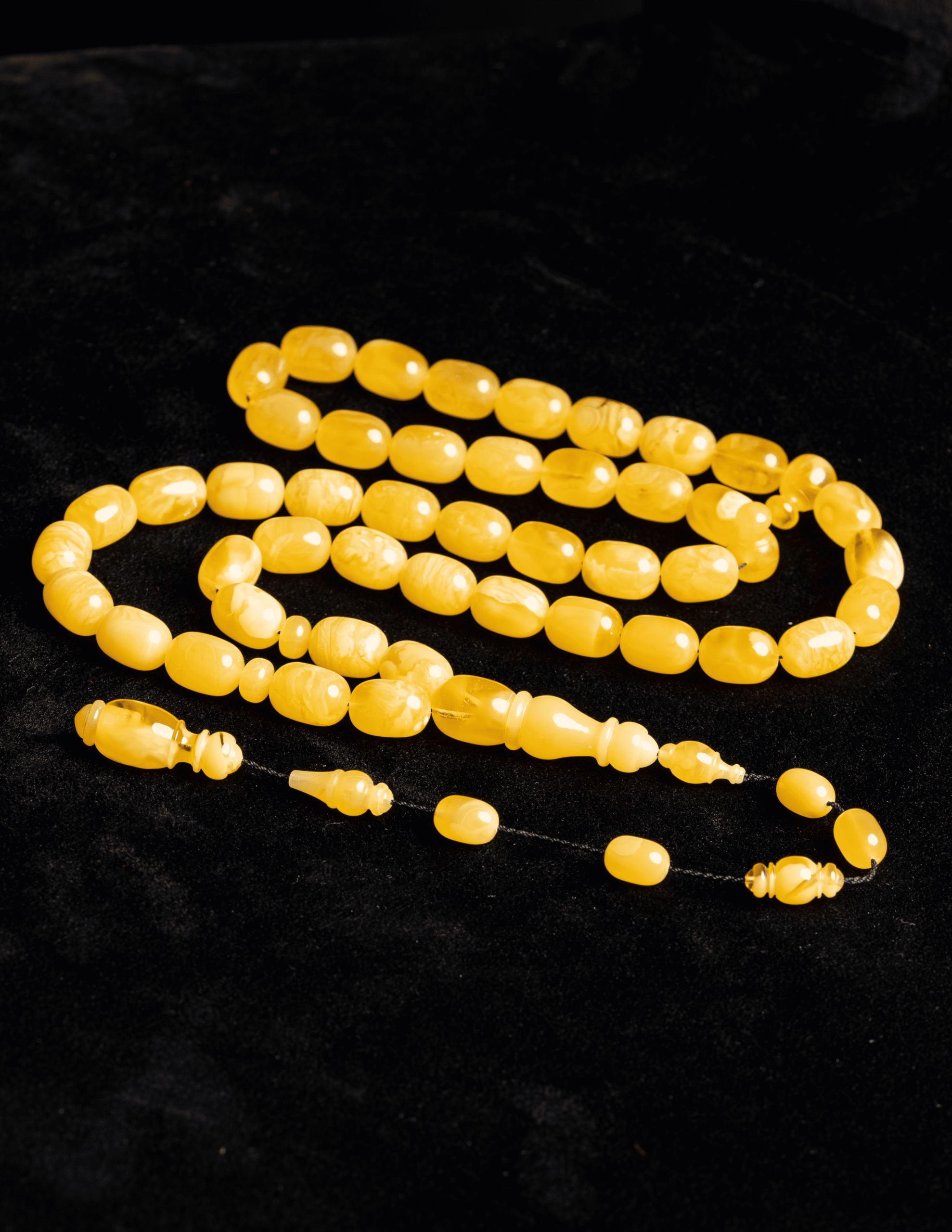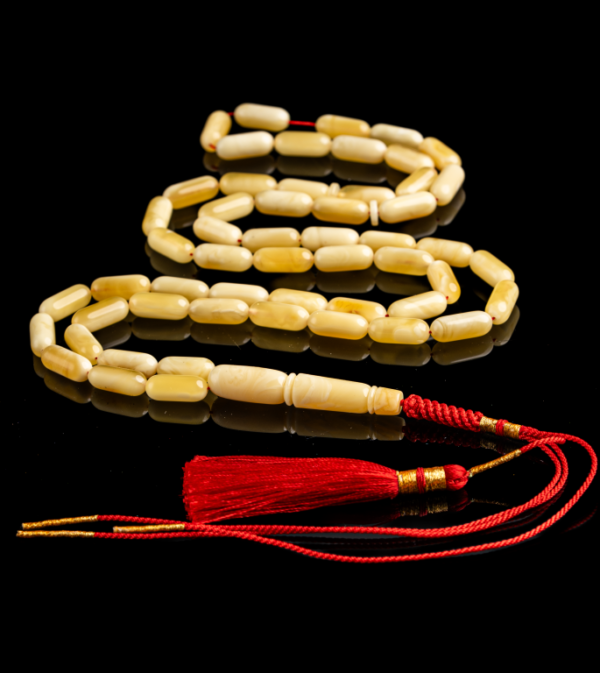 مسباح فاخر مصنوع من حجر كهرمان واحد كامل ما يمنحه انسجامًا طبيعيًا في اللون والملمس وقيمة عالية عند أهل الخبرة