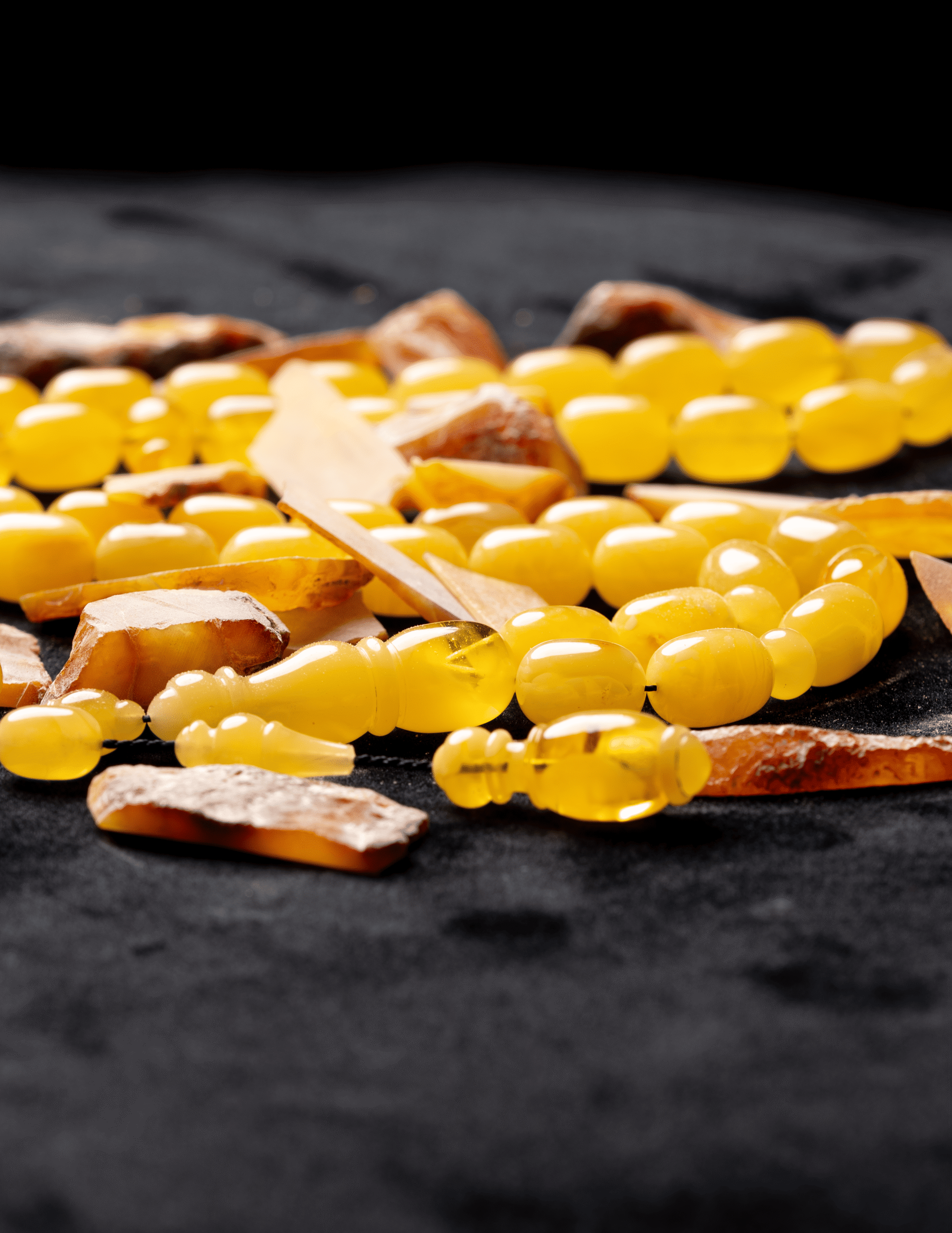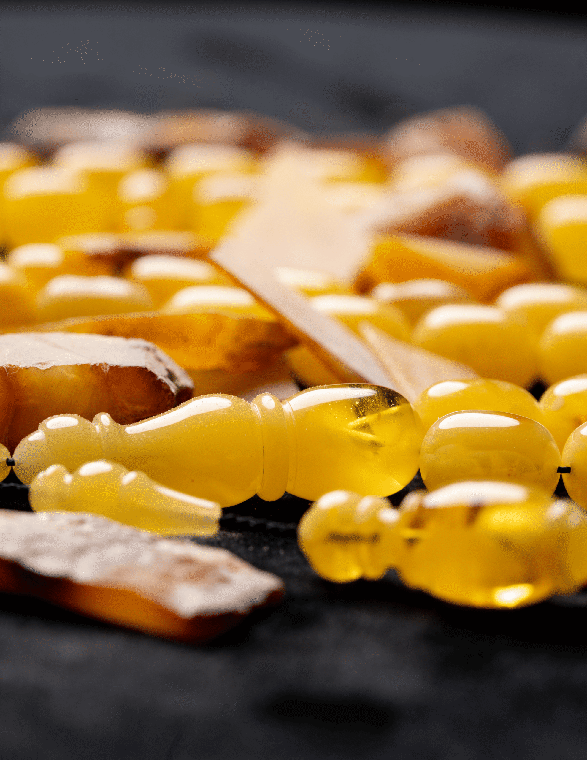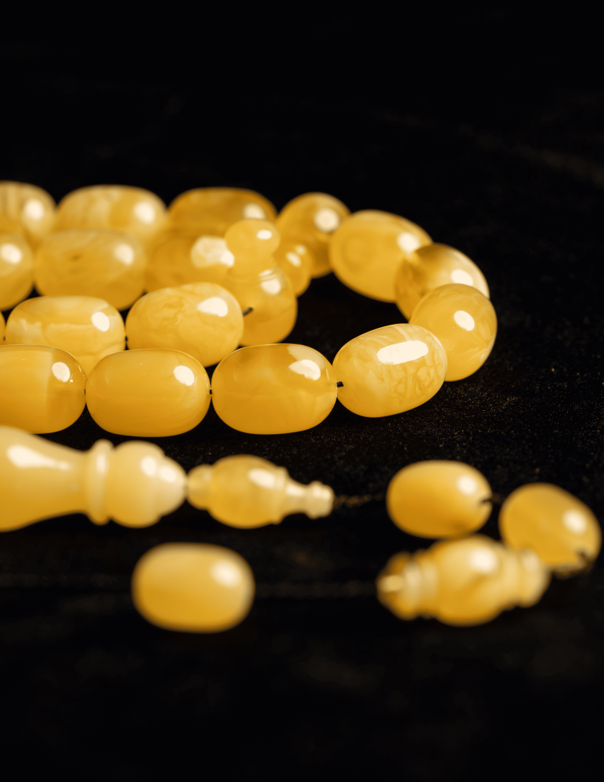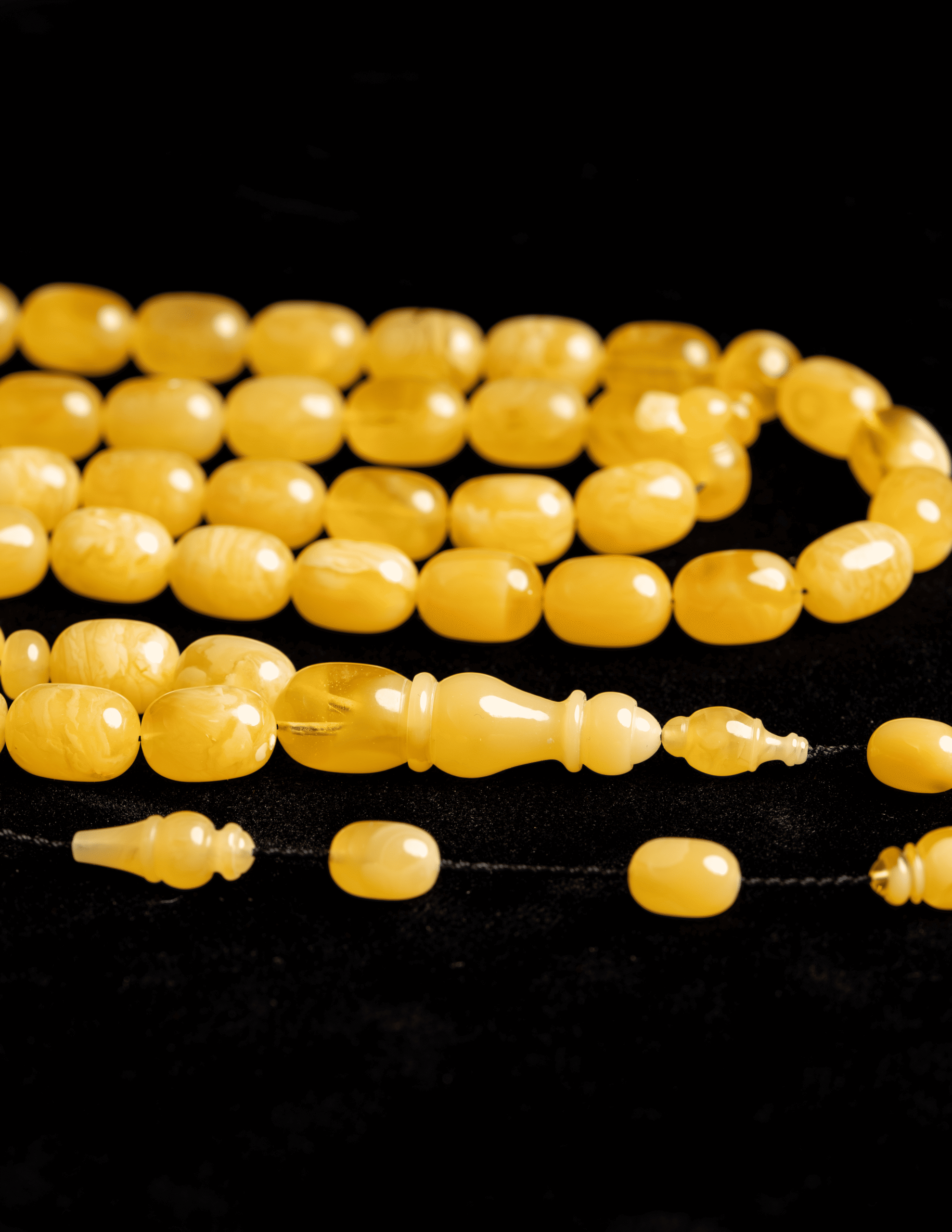 مسباح فاخر مصنوع من حجر كهرمان واحد كامل ما يمنحه انسجامًا طبيعيًا في اللون والملمس وقيمة عالية عند أهل الخبرة