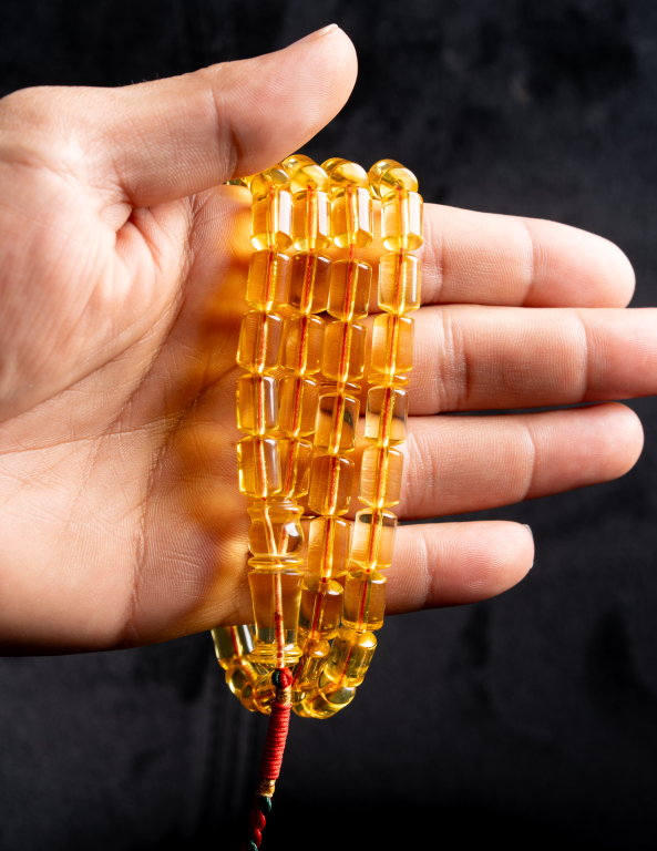 مسباح من الكهرمان الطبيعي الشفاف يتميز بقصّته الصندوقية الأنيقة التي تُبرز جمال الحجر ولمعته الصافية. تنعكس الإضاءة على الخرز بشكل متوازن، ما يمنحه حضورًا فخمًا ووضوحًا يلفت النظر