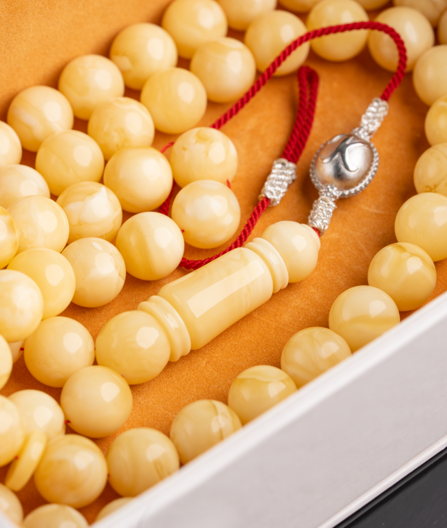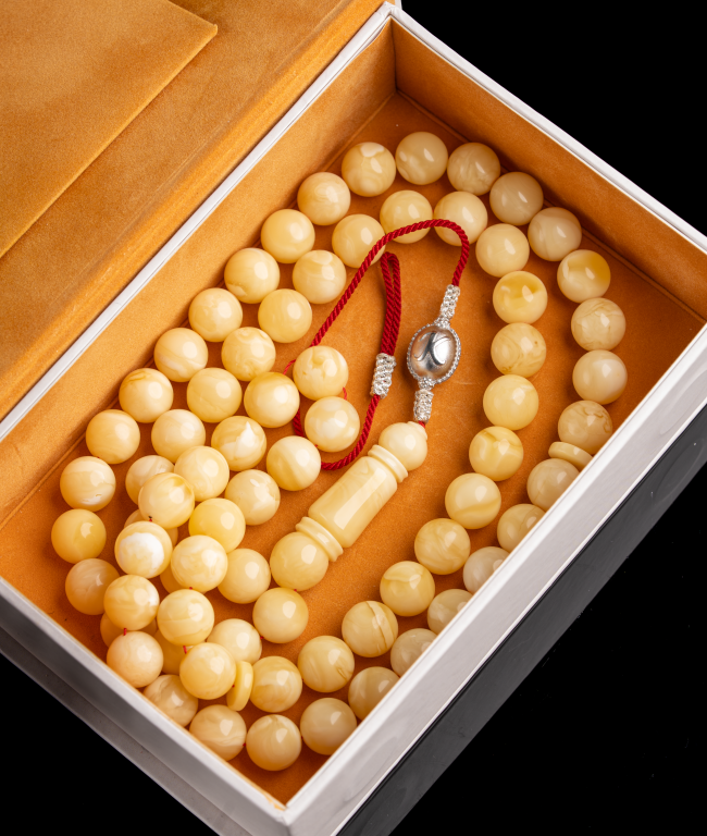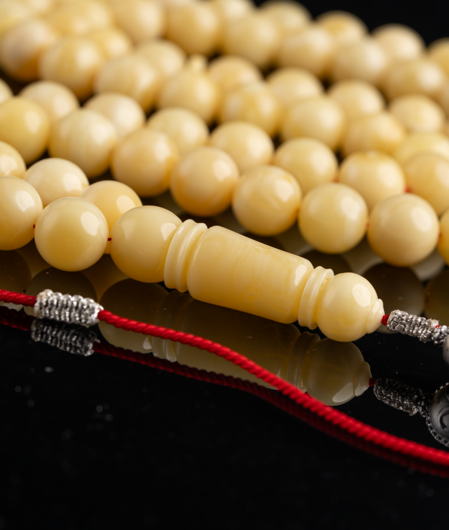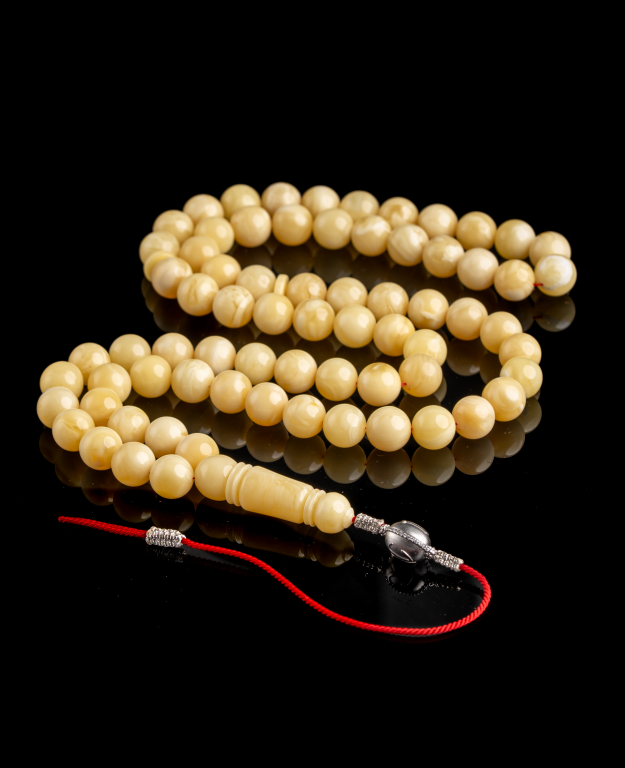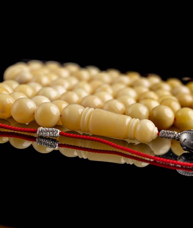 مسباح فاخر مصنوع من كهرمان طبيعي بخامة محاحي راقية، يتميّز بجماله الهادئ وملمسه الناعم الذي يعكس جودة الكهرمان الأصيل