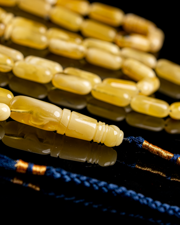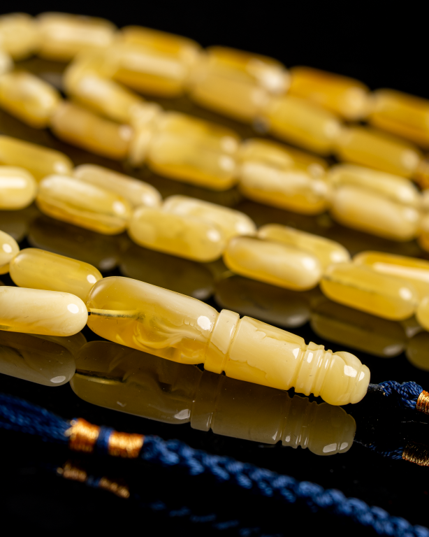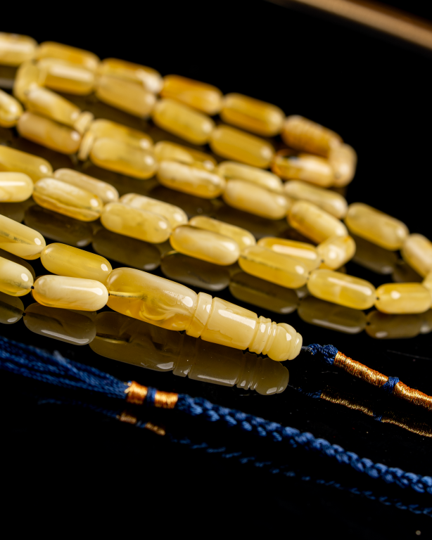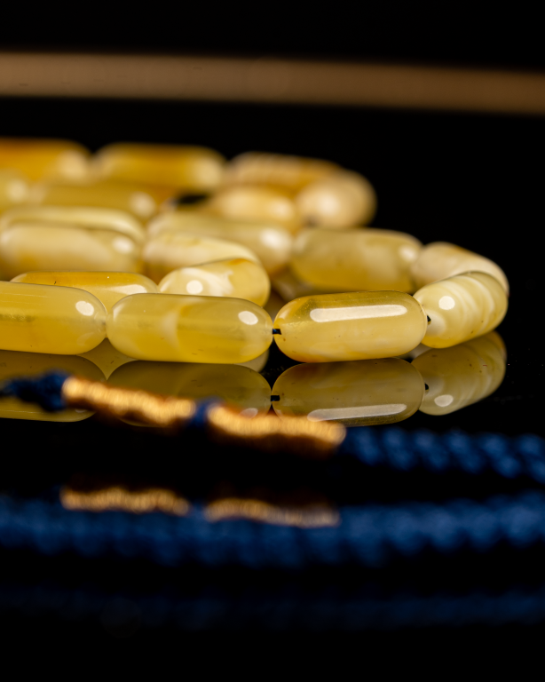 قطعة أنيقة بخامة كهرمان أصلي تتداخل فيها التبرّقات الطبيعية لتعطي كل خرزة هوية مختلفة ولمسة حيّة. القصة الصنوبريّة تضيف فخامة كلاسيكية ومسكه مريحة في اليد، مع توازن جميل بين الوزن والشكل. مسباح يجمع روح التراث بدقة الصنعة، مناسب للاستخدام اليومي والاقتناء كقطعة مميزة تزداد جمالًا مع الوقت