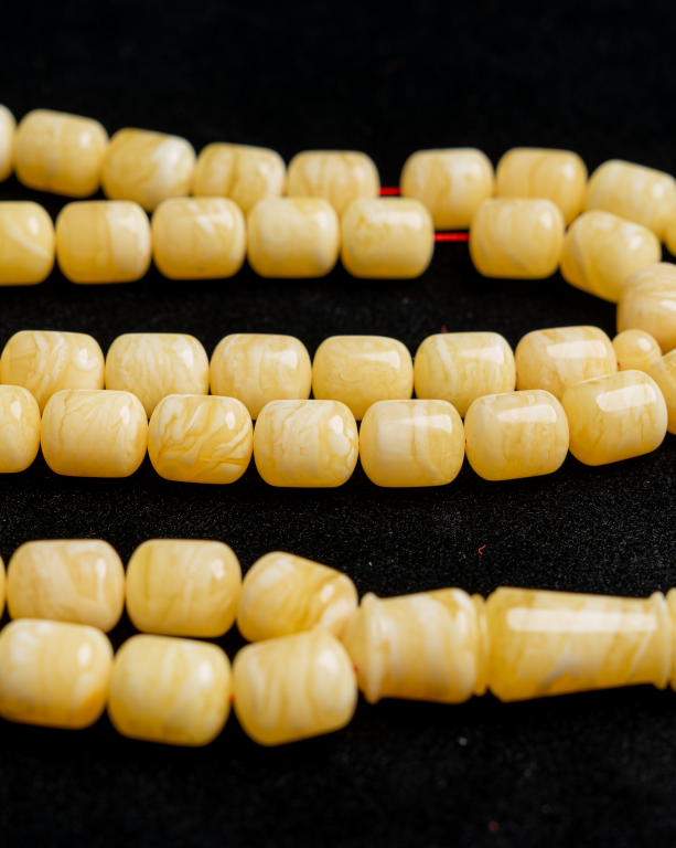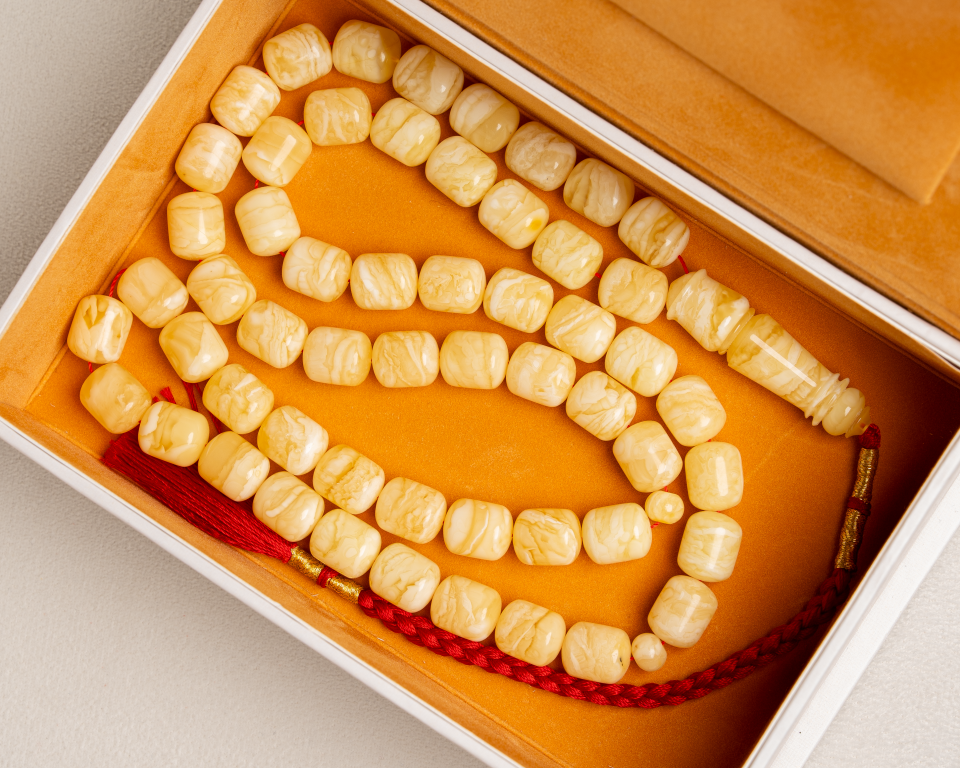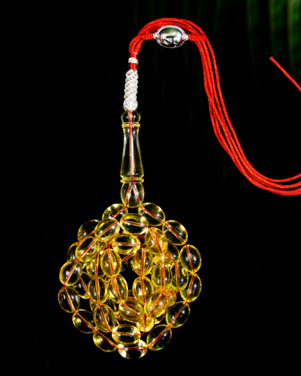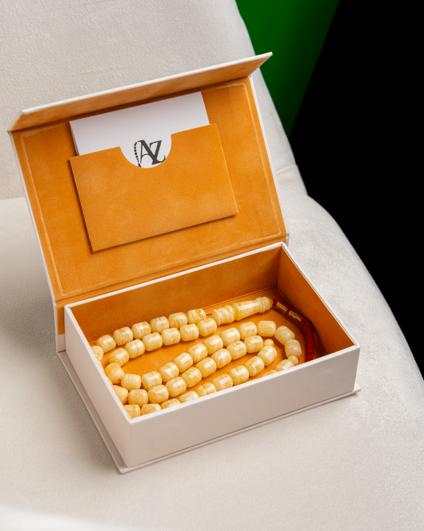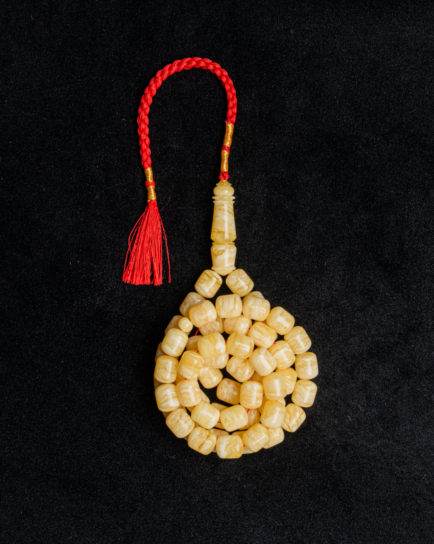كهرمان طبيعي مشغول يدويًا بعناية في ورشة علاء فريد، أحد الأسماء المعروفة في عالم صناعة المسابيح، والمميّز بأسلوبه الخاص ودقته في اختيار الخامات وتشطيب القطع