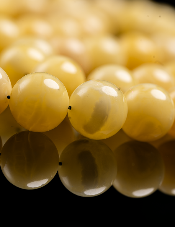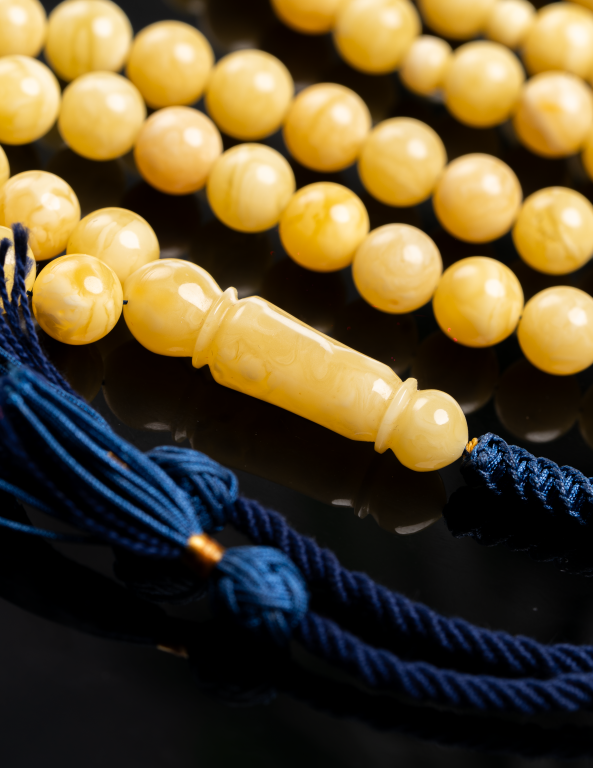 مسباح من الكهرمان الطبيعي بتشخيط وتبرقع جميل يمنح كل خرزة طابعًا فريدًا وحضورًا أنيقًا، مع شاهد مميز يضيف لمسة فخامة متناسقة