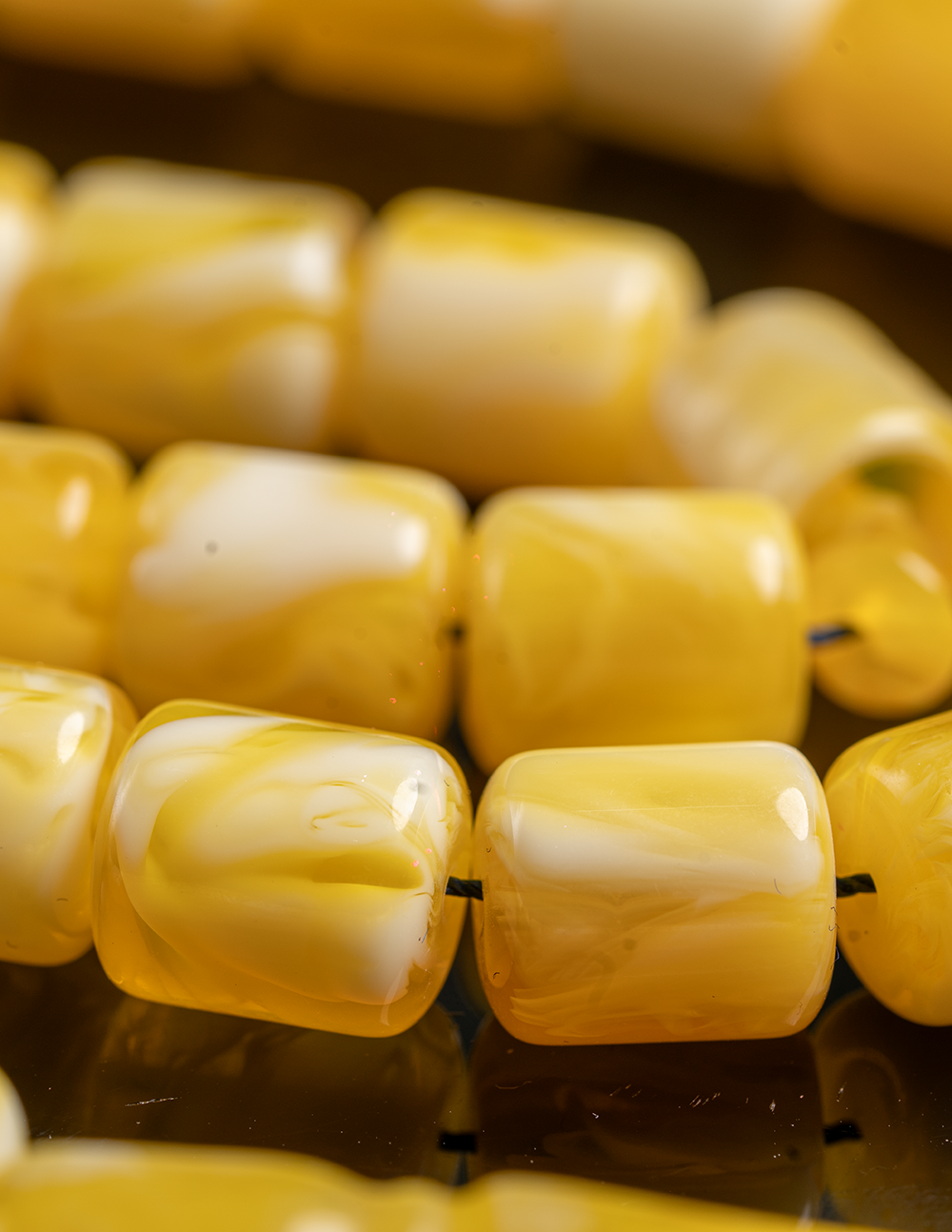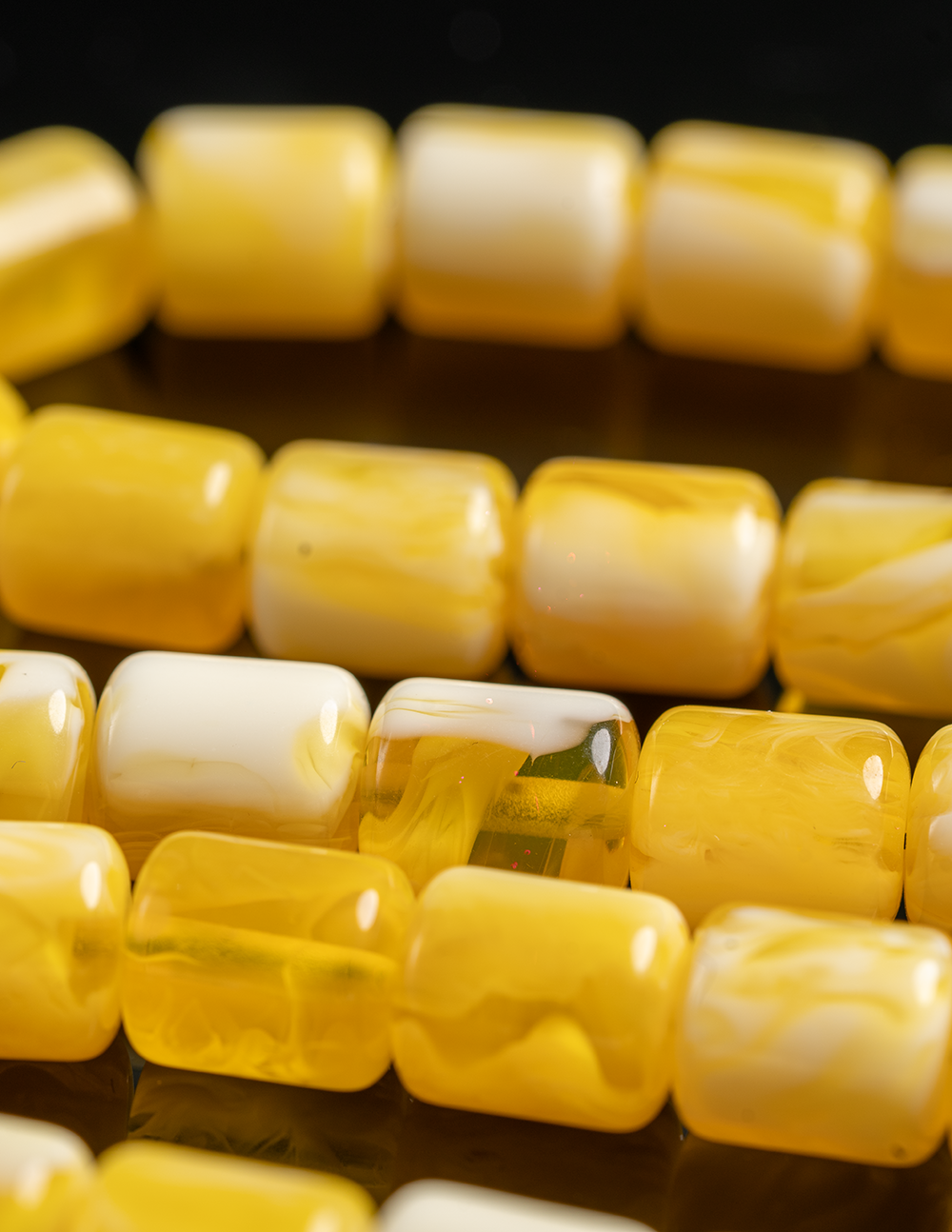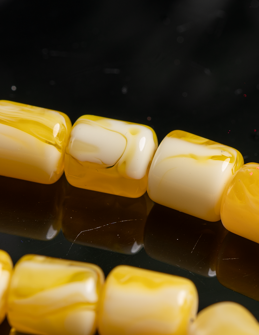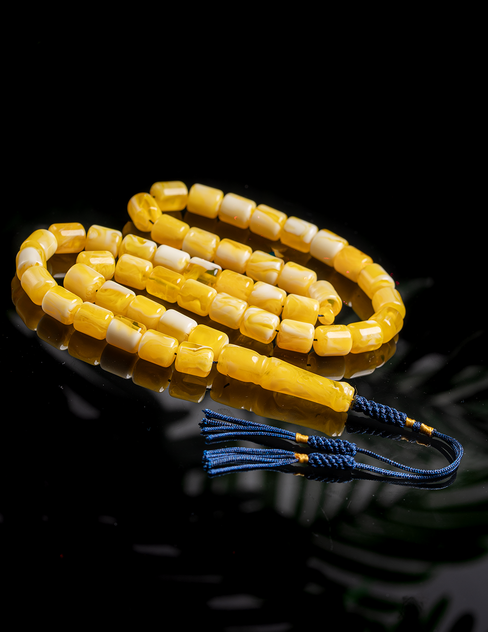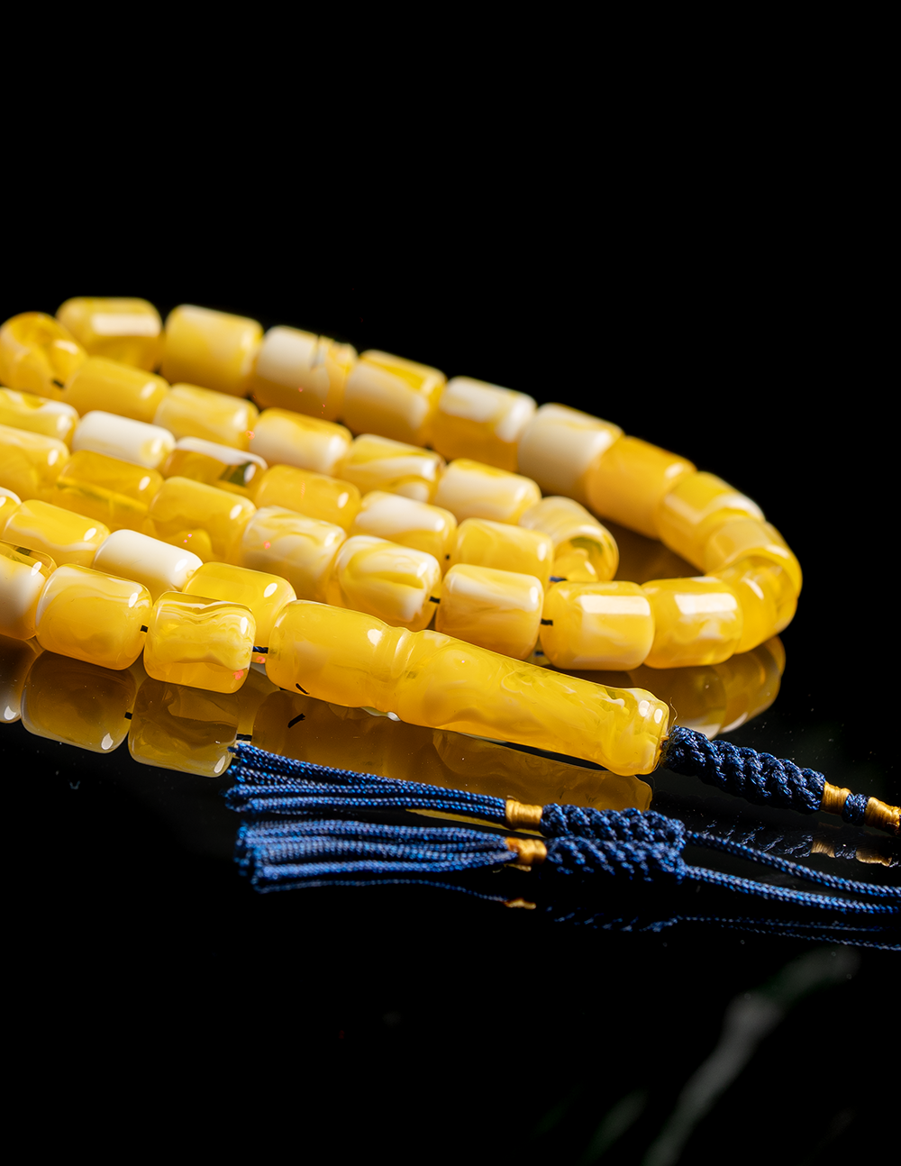 قطعة أنيقة بتصميم صندوقي مبرقع يمنح الخرز طابعًا مميزًا قريبًا من شكل الكهرمان الطبيعي، بحضور راقٍ ولمسة كلاسيكية جميلة. مناسب للاستخدام اليومي والاقتناء لمحبي المسابيح ذات الشكل التراثي الأنيق