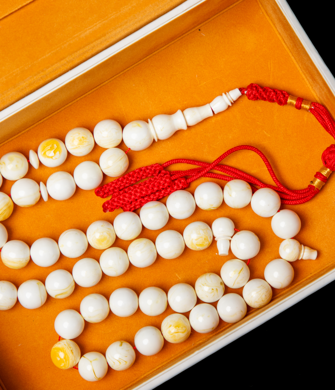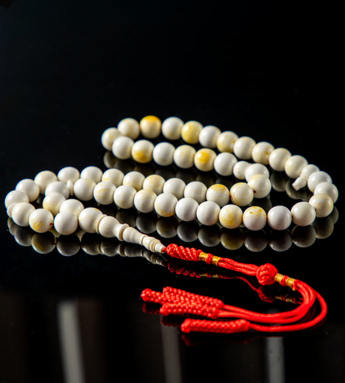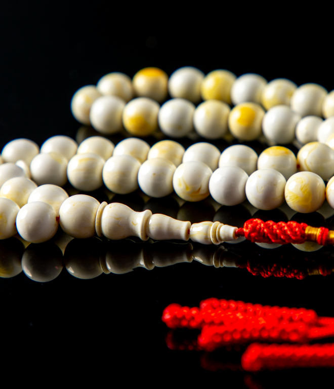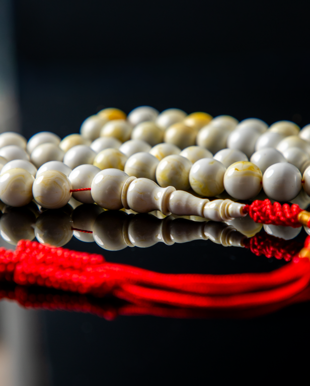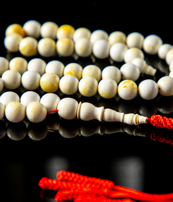 مسباح مستكة دائري أبيض بتبرقع خفيف يعطيه لمعة ناعمة تتغيّر مع الإضاءة، قصّته متناسقة وخراطته نظيفة، مريح باليد ولونه هادي وأنيق يناسب كل الأذواق، اختيار راقي للي يحب البساطة والفخامة في نفس الوقت