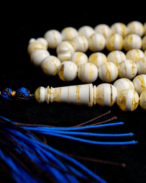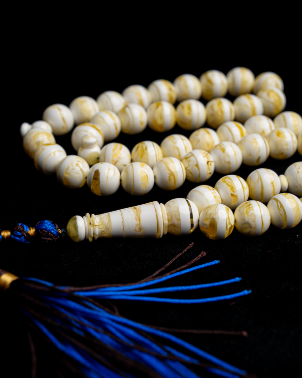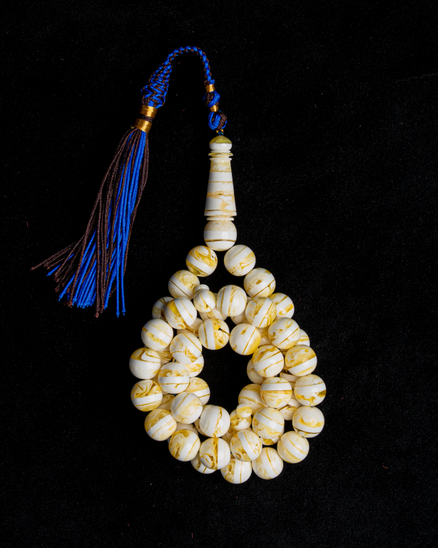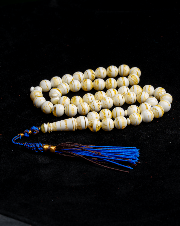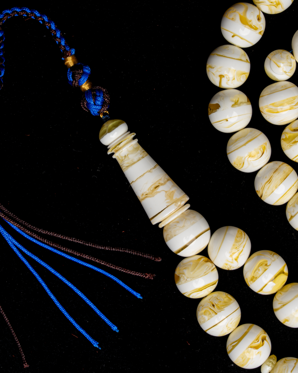 مسباح مستكة بقصّة دائرية وتشخيط عرض يبرز جمال الخرز ويعطيه طابع مميز، لونه هادي مع خطوط واضحة تزيده فخامة، خراطته متقنة ومسكته مريحة باليد، قطعة للي يقدّر التفاصيل ويحب المسابيح اللي تجمع بين الذوق والتميز.